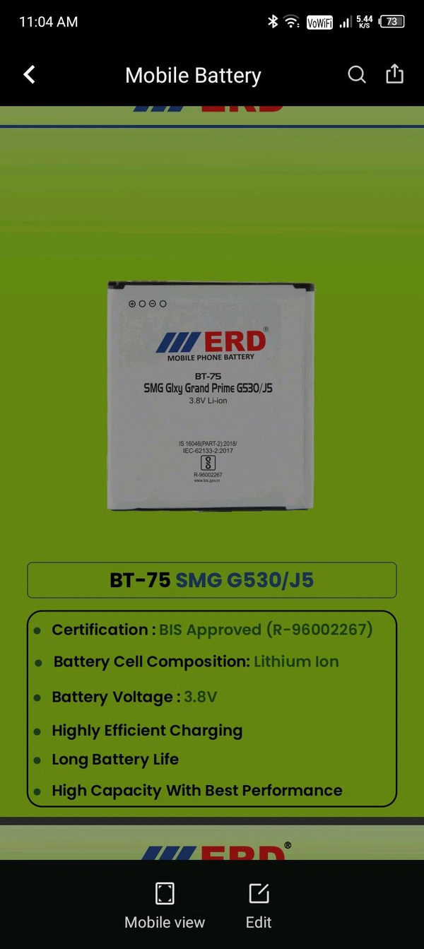 ERD LITHIUM-ION BATTERY BT 75 SMG G530/J5