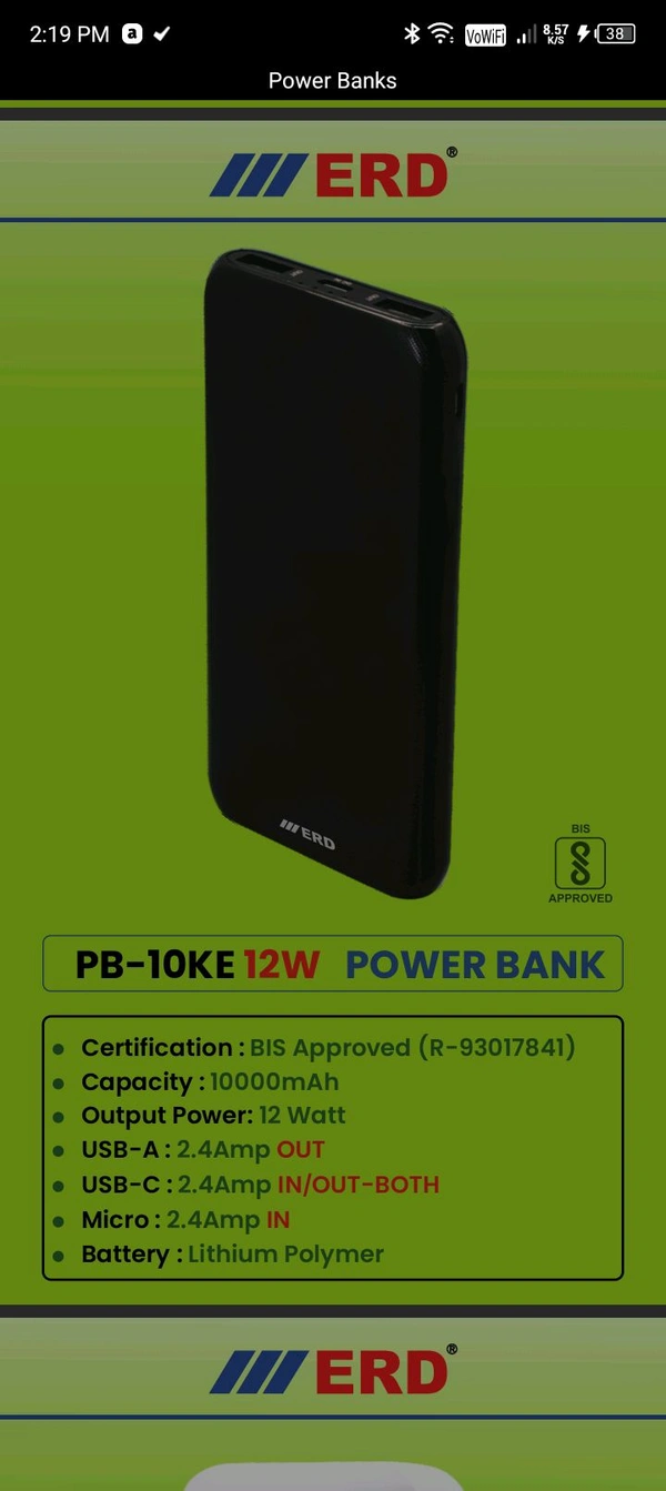 ERD PB-10 KE 10000mah 12W POWER BANK