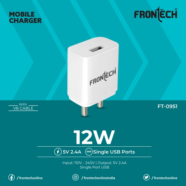 FRONTECH 0951W- MOBILE CHARGER 2.4 AMP SINGLE WITH WHITE V8 CABLE (FT)